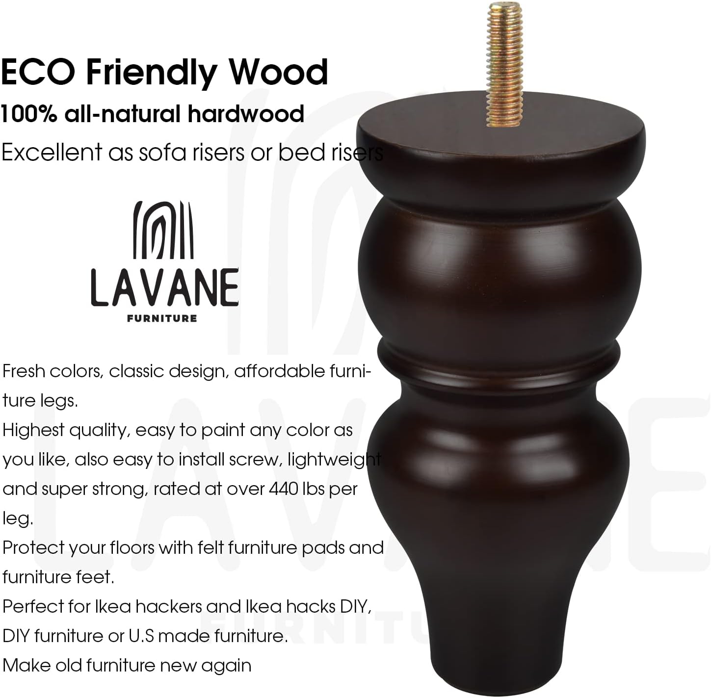 Solid Hardwood Furniture Legs with Color Finished - Solid hardwood bun feet with color finished set of 4 for DIY furniture projects, furniture restoration and furniture height raising projects. - You will have everything ready to get the job down. - Perfect for furniture sofa, table, chair, couch, chest of drawes, cabinets and more! Easy Installation - With this full set of wood furniture legs, all you need to do to get the job done is to pre-drill M8 screw holes, attach the leg mounting plates, and install furniture wood legs. - The stylish design and expertly crafted finish will have people wondering if you bought a whole new furniture set. - Easy installation and universal fit mean that you will have the upgraded furniture ready for use in no time! Specification - Material: Eucalyptus; - Diameter: 9cm / 3.5 inch; - Height: 20cm / 8 inch; - Screw Thread: M8 (8mm); Note - 1. Due to the natural wood, it is normal that there is a little deviation of item size, pattern and color, thanks for your understanding; - 2.The wooden legs are funiture Replacement only, NOT Handicraft. Due to natural material, it may NOT be 100% perfect, slightly imperfect can NOT be avoided, please understand; Package Included - 4x Wooden Furniture Legs - 4x Iron Plates - 1x Screw Set